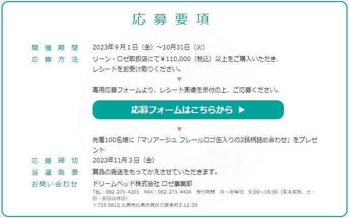 リーン・ロゼ取扱店にて¥110,000( 税込) 以上をご購入いただき、レシートをお受け取りください。