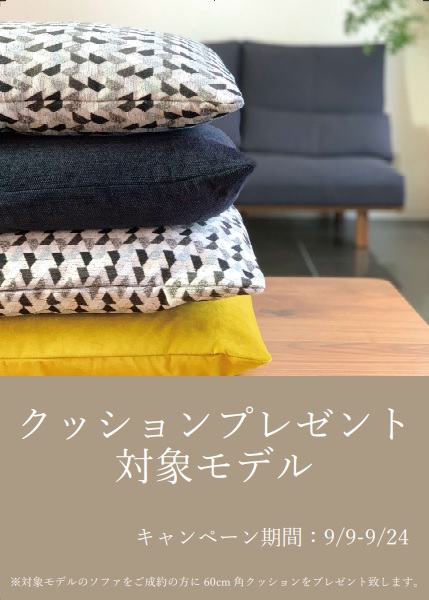 期間中、SPIGAブランドのソファをご成約の方に、60cm角のクッションをプレゼント。生地も選べます(ソファ本体と同ランクの生地に限る)